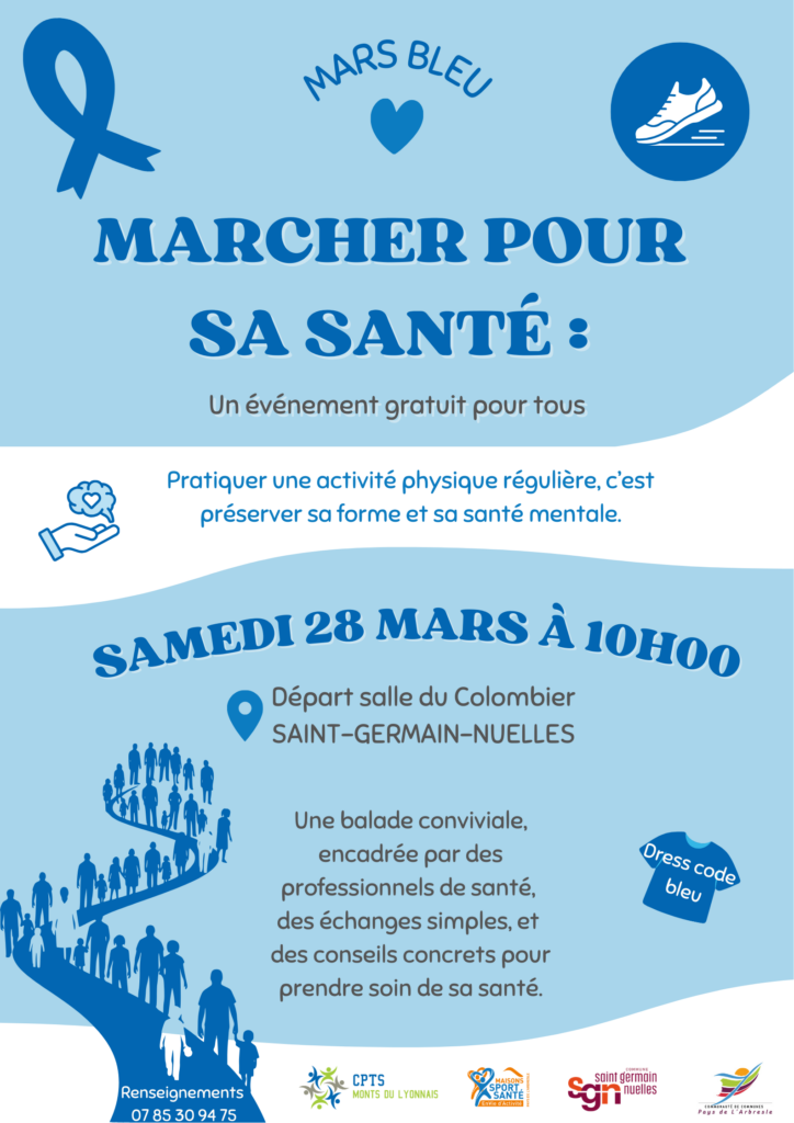 Dans le cadre de Mars Bleu, mois de sensibilisation au dépistage colorectal, une marche sera organisée par la CPTS monts du lyonnais et la Maison Sport Santé du Pays de L’Arbresle.