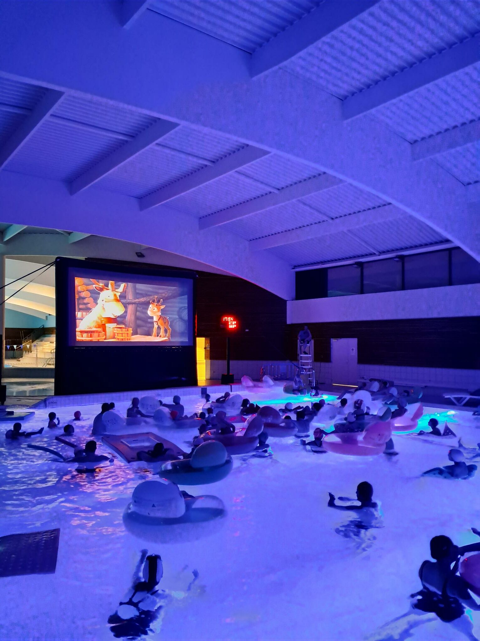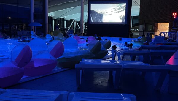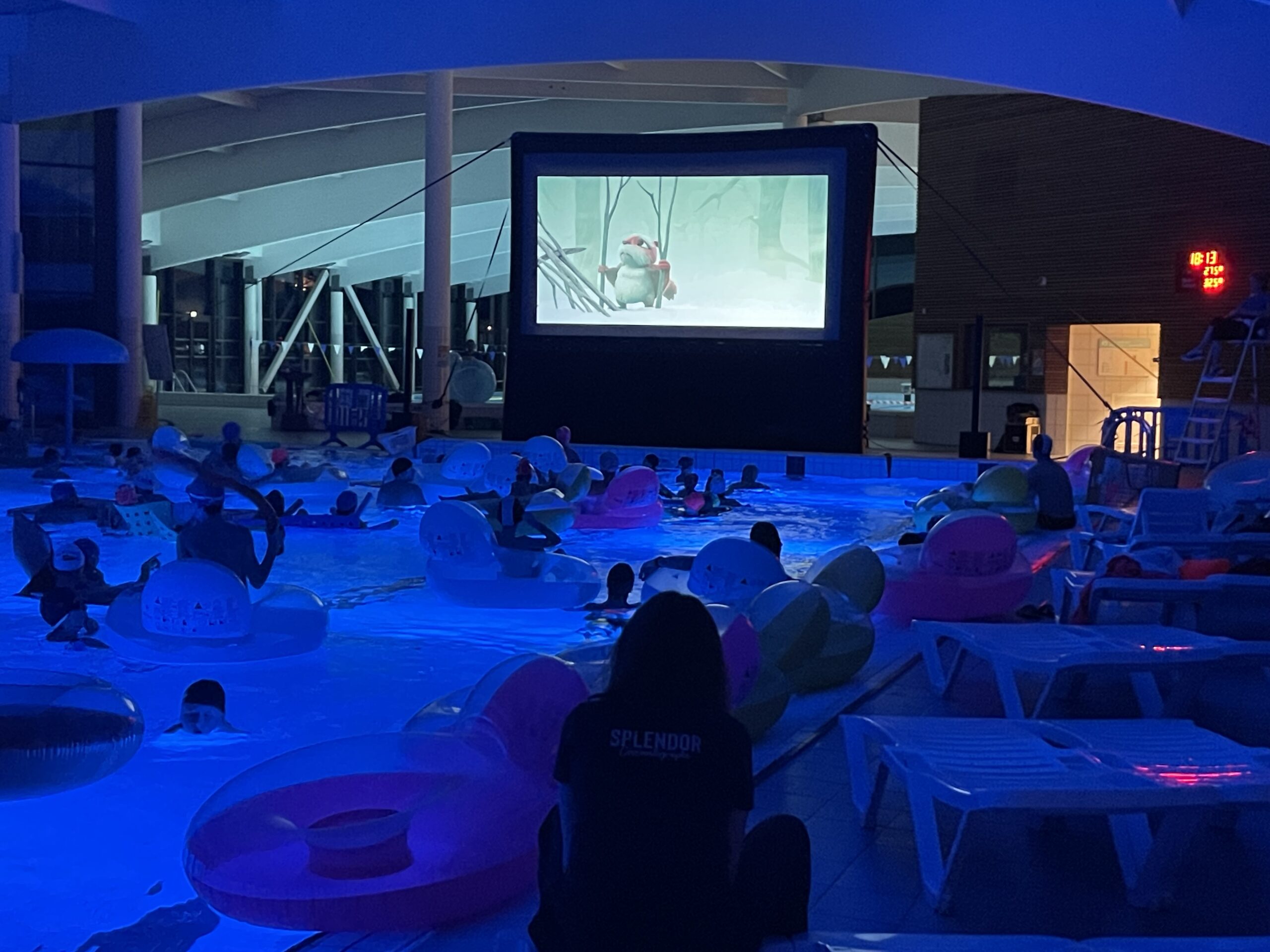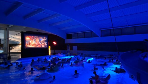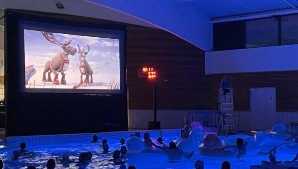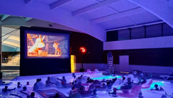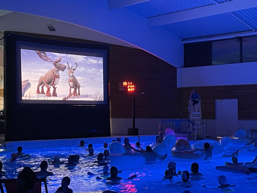 Installés dans des bouées ou immergés dans une eau chauffée à plus de 32 °C, petits et grands ont profité de la projection du film « Niko le petit renne : mission Père Noël ».