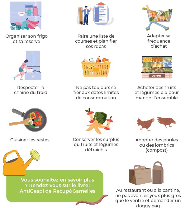 Le gaspillage alimentaire c’est réel ! Cela représente environ 30kg/an/habitant soit environ 160 € ! Les 4 produits les plus gaspillés sont : les légumes, les liquides, les fruits et les céréales/riz/pâtes. Pour éviter cela on vous propose quelques astuces :