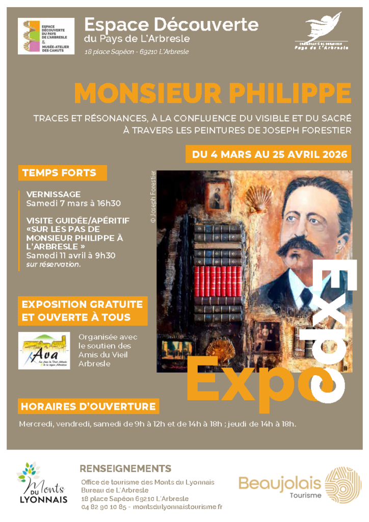 Visite guidée/apéritif « Sur les pas de M. Philippe à L’Arbresle » samedi 11 avril à 9h30, sur réservation.
