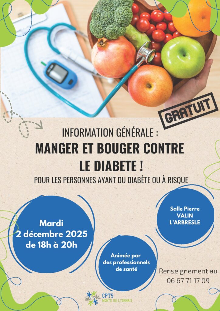 La CPTS des Monts du Lyonnais propose, avec la présence de professionnels de santé, une information générale pour les personnes ayant du diabète ou à risque.